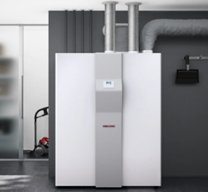 With central ventilation systems, there is a difference between extract air systems and supply/extract air systems. The simplest and most cost-effective system for central mechanical ventilation is an extract air system. Stale air is removed via ducts from areas such as the kitchen, bathroom and toilet. This causes negative pressure, which allows fresh air to be drawn through outlets outside, directly into areas such as the living room, playroom and bedrooms. The amount of air extracted is determined by the fan capacity. You're able to match you're the air flow rate to meet your needs with a simple switch. With a small heat pump, the extracted air can be used for heating hot water and central heating. Using this air at high temperatures as a heat source is incredibly efficient.